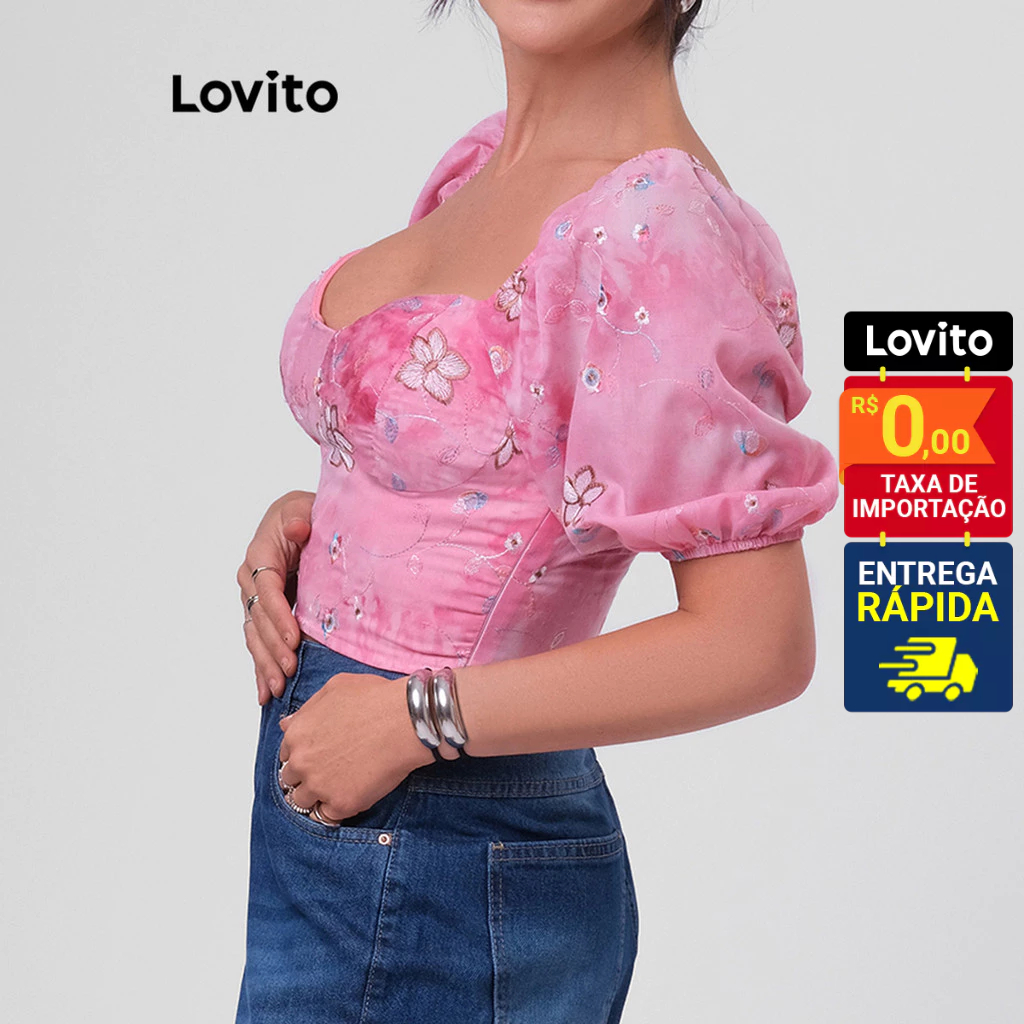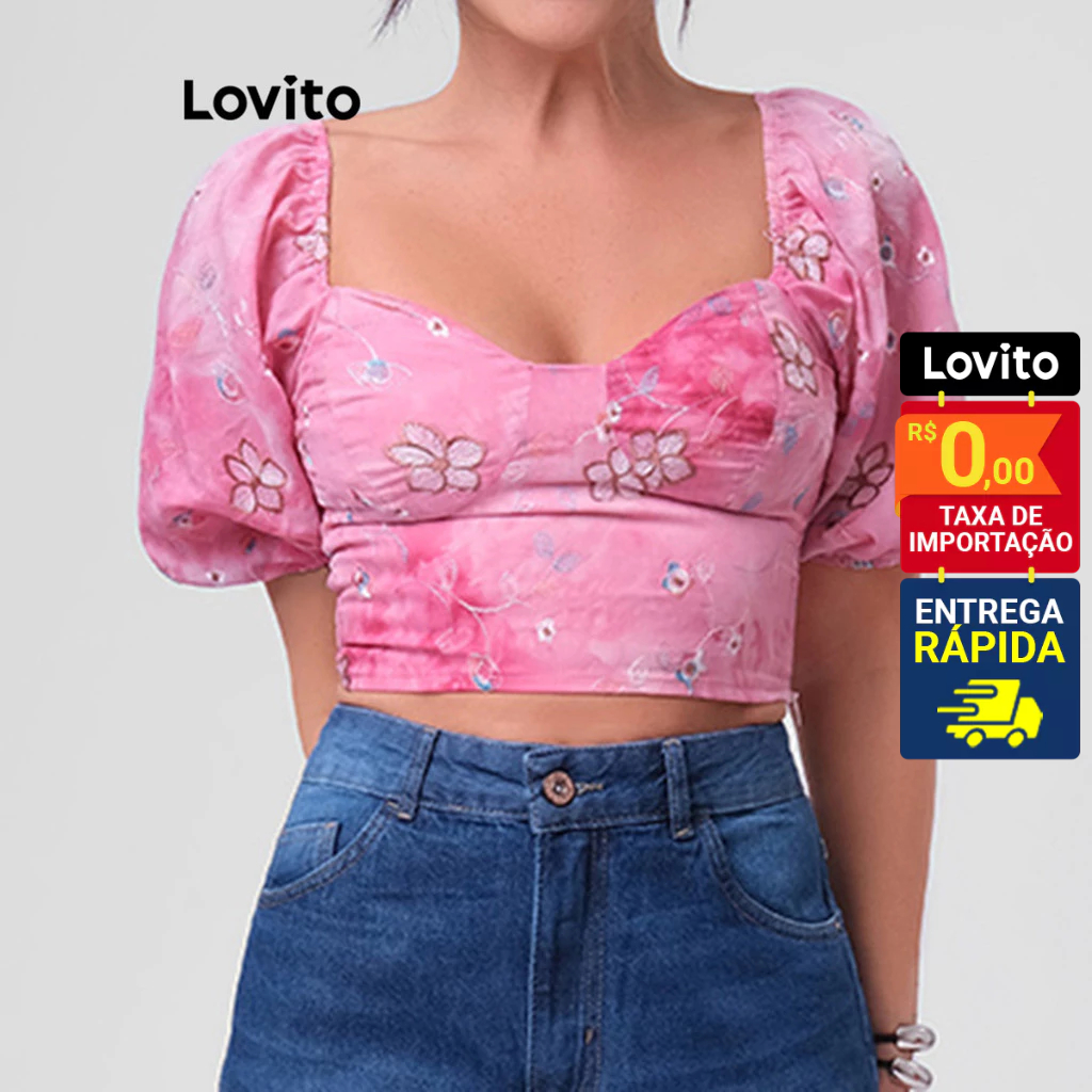 Lovito Blusa Feminina Decote Coração Manga Bufante Cropped Estampada Floral Elegante Basica LB278BRL307