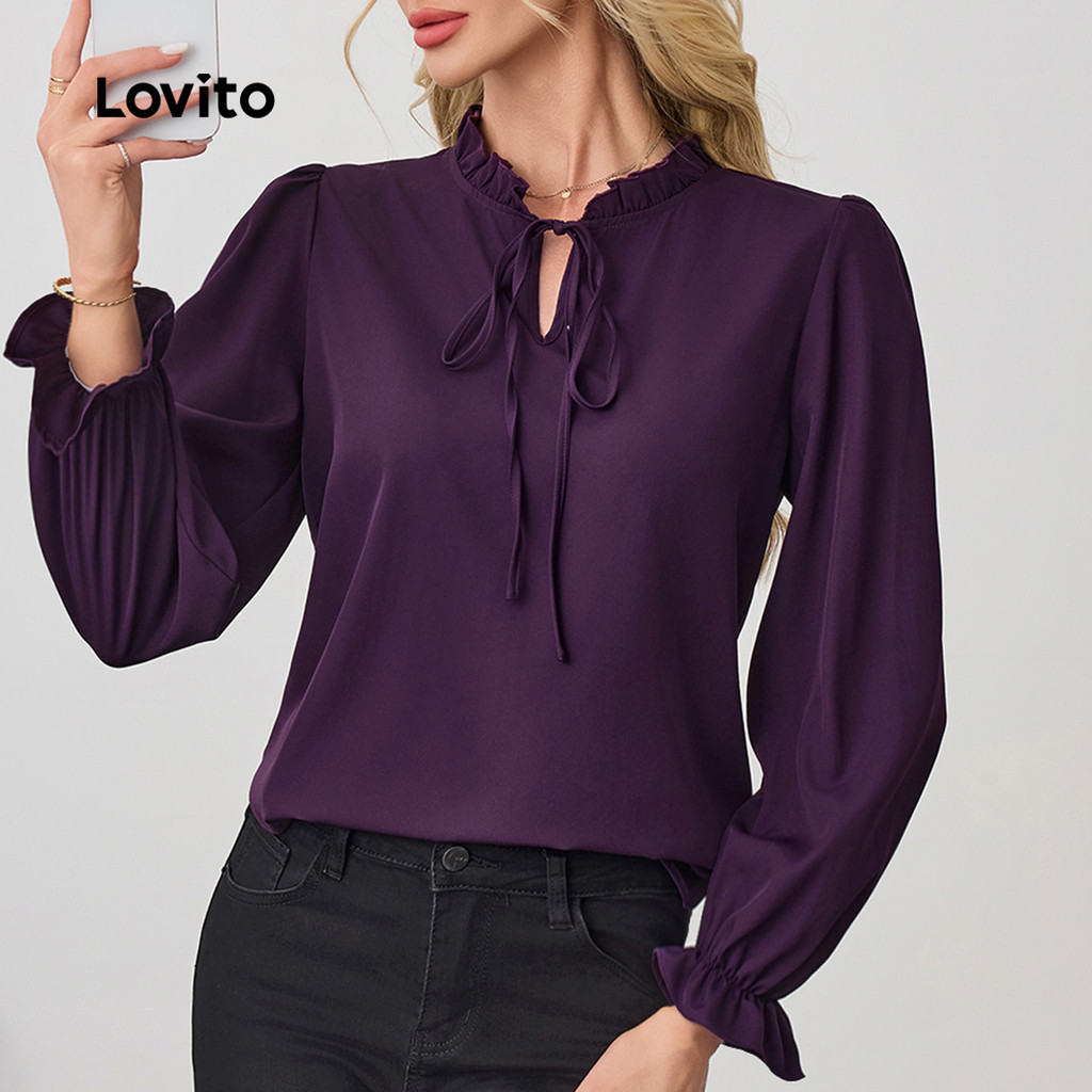 Lovito Blusa Feminina Elegante Lisa Com Amarração Frontal Manga Bispo Outono Inverno LBL24434
