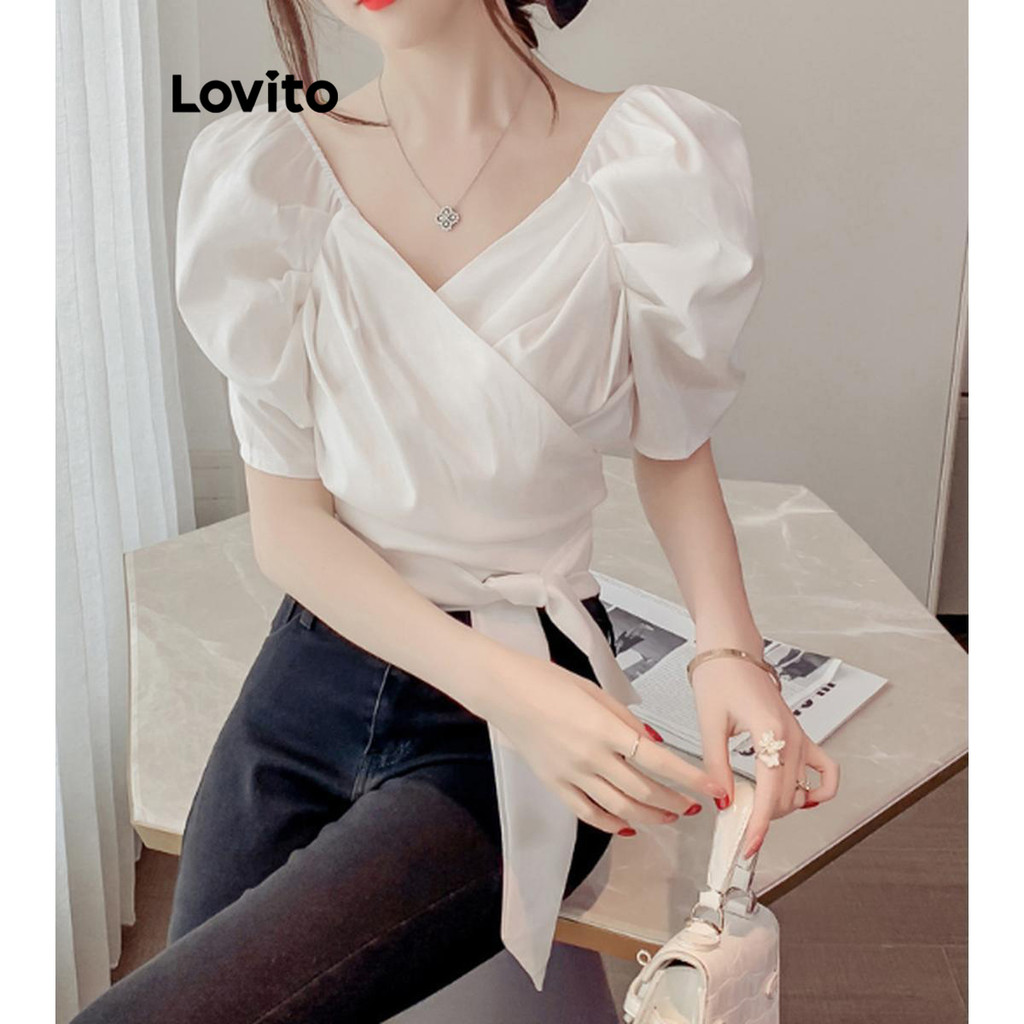 Lovito Blusa Feminina Lisa com Amarração Elegante LNE61187