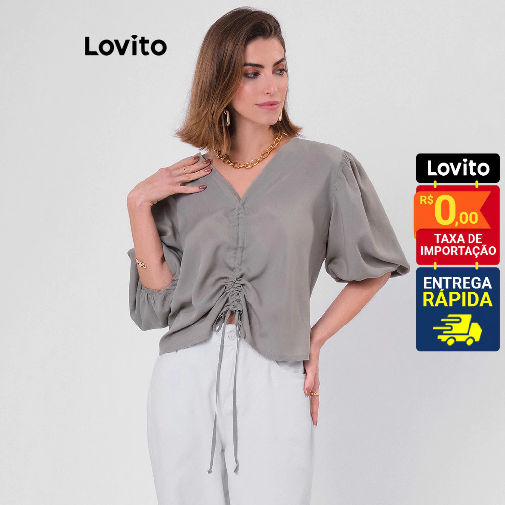 Lovito Blusa Transpassada na Frente com Amarracao Decote V manga Curta Feminina LBRL010