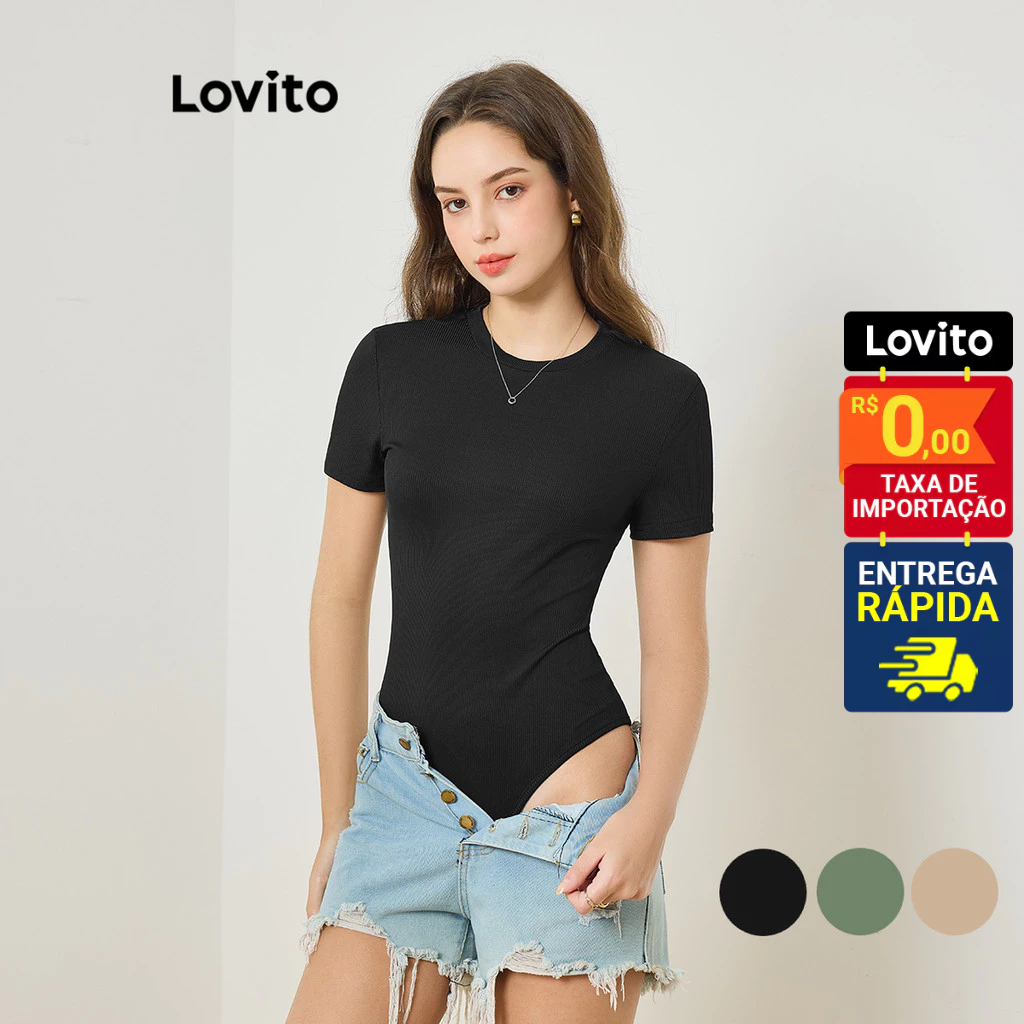 Lovito Body Malha Canelada Manga Curta Basico Feminino L83ED036