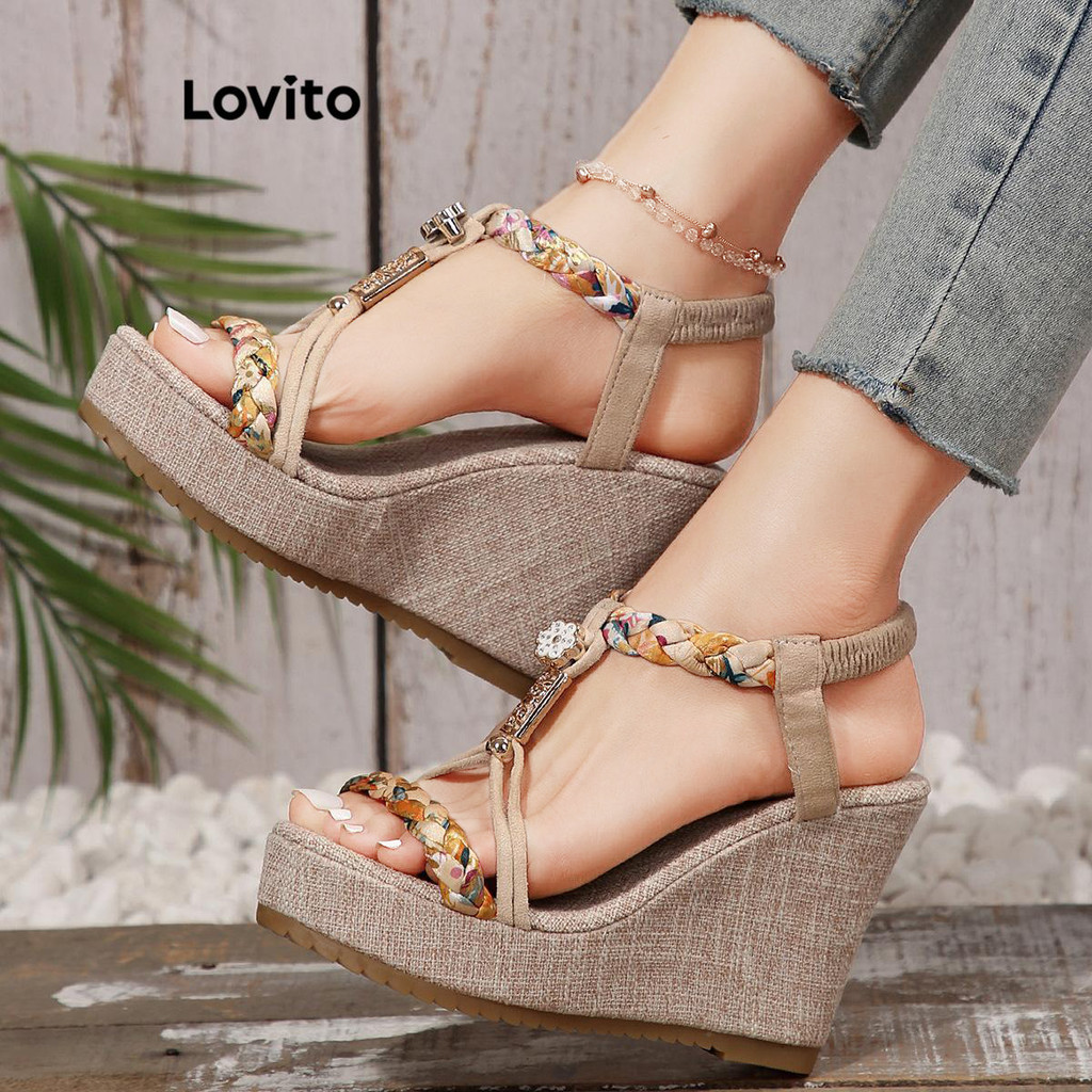 Lovito Boho cor lisa bloco tecido esqueleto cunha sapatos estilo étnico cunhas para mulheres LFA65322
