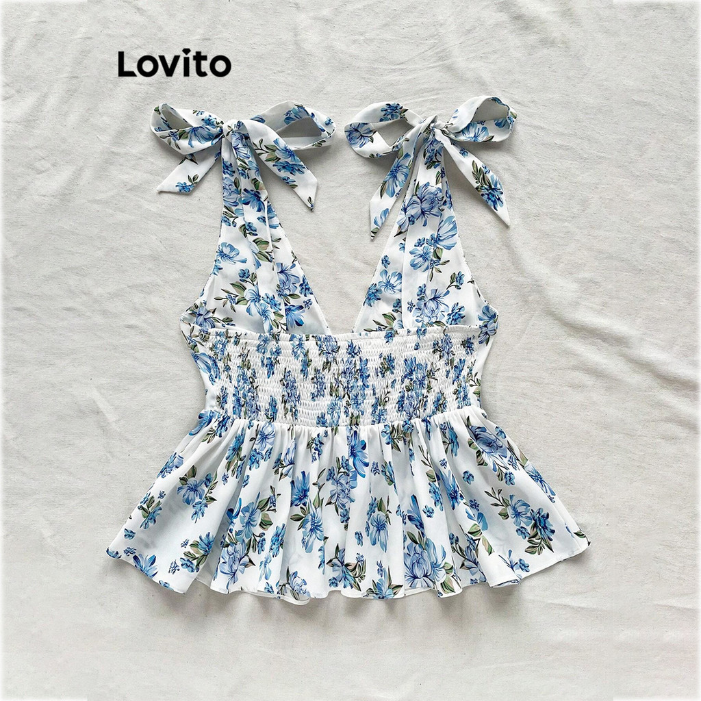 Lovito Boho Top Ditsy Floral Lace Up Regata De Verão Para Mulheres L99ED686