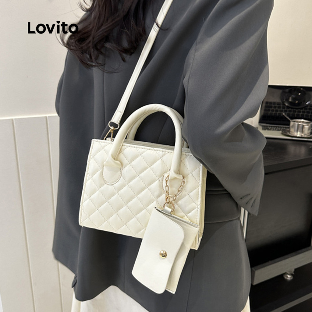 ✅DESTAQUES -❤️- Padrão de diamante -Conjunto de duas peças -Deslocamento diário -❤️anual ✅DESCRIÇÕES Estampa / Padrão:Lisa Estilo:Casual Tipo de fechamento: Estrutura das bolsas:Compartimento principal Tipo de bolsa:Bolsa quadrada Material:PU Feito na China ✅INSTRUÇÕES DE CUIDADOS 1. Mantenha materiais como couro, materiais sintéticos e acessórios de metal longe da exposição direta ou excessiva à umidade, líquidos, calor e luz solar. A exposição a estes elementos pode causar desgaste permanente. 2. A fricção excessiva e o contato com substâncias oleosas, como cosméticos ou solventes, podem causar danos, desbotamento ou transferência de cor em roupas e superfícies de cores claras. 3. Use um pano macio e úmido para limpar manchas, poeira ou sujeira. 4. Quando não estiver em uso, guarde os itens em uma caixa ou saco protetor contra pó em local fresco e seco. ✅O PACOTE INCLUI 1XBolsa ✅INTRODUÇÃO LOVITO A Lovito é uma marca em crescimento que acredita no poder das meninas. Estamos comprometidos em oferecer opções de roupas fashion e acessíveis, para todos os estilos, necessidades e identidades. Acreditamos que a moda deve ser divertida, liberadora e fazer você se sentir incrível. Afinal, o melhor acessório para qualquer look é a autoconfiança! ✅NOTAS DE COMPRA Antes de comprar, dê uma olhadinha na tabela de medidas disponível no site. Lembre-se de que, por serem feitas manualmente, as medidas podem variar de 1 a 2 cm. As cores dos produtos também podem ter pequenas diferenças em relação às fotos, dependendo da iluminação e das configurações do seu dispositivo. Siga nossa loja e conheça novos itens e as melhores ofertas para você!! Se você tiver alguma dúvida, converse conosco e responderemos o mais rápido possível.😊