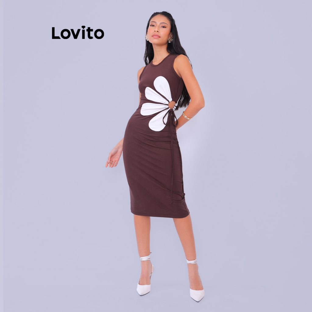 Lovito Bossa l Vestido Feminino Casual Liso com Recorte de Flores DRB889BRL919