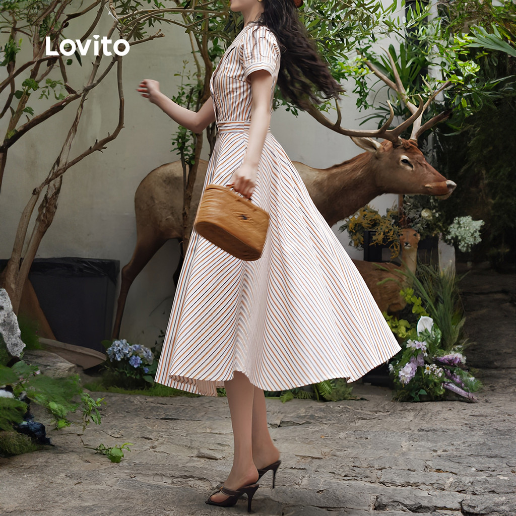 ✅DESTAQUES -❤️Botão -❤️Padrão -❤️Leve e respirável -❤️Primavera e verão ✅DESCRIÇÕES Estampa / Padrão:Listrado Estilo:Elegante Tipo de vestido:Aparentemente, não há uma tradução direta e comum para "Flared" em português, pois depende do contexto. Se se refere a algo que se alarga na ponta, pode ser traduzido como "em guarda-chuva" ou "com aba". Por favor, forneça mais contexto para uma tradução mais precisa. Tamanho Plus:Não Material:Poliéster Composição:95% poliéster + 5% elastano Tipo de modelagem: Corte regular Transparência:Não Esticar:não esticado Feito na China ✅O PACOTE INCLUI 1XVestir ✅INTRODUÇÃO LOVITO A Lovito é uma marca em crescimento que acredita no poder das meninas. Estamos comprometidos em oferecer opções de roupas fashion e acessíveis, para todos os estilos, necessidades e identidades. Acreditamos que a moda deve ser divertida, liberadora e fazer você se sentir incrível. Afinal, o melhor acessório para qualquer look é a autoconfiança! ✅NOTAS DE COMPRA Antes de comprar, dê uma olhadinha na tabela de medidas disponível no site. Lembre-se de que, por serem feitas manualmente, as medidas podem variar de 1 a 2 cm. As cores dos produtos também podem ter pequenas diferenças em relação às fotos, dependendo da iluminação e das configurações do seu dispositivo. Siga nossa loja e conheça novos itens e as melhores ofertas para você!! Se você tiver alguma dúvida, converse conosco e responderemos o mais rápido possível.😊