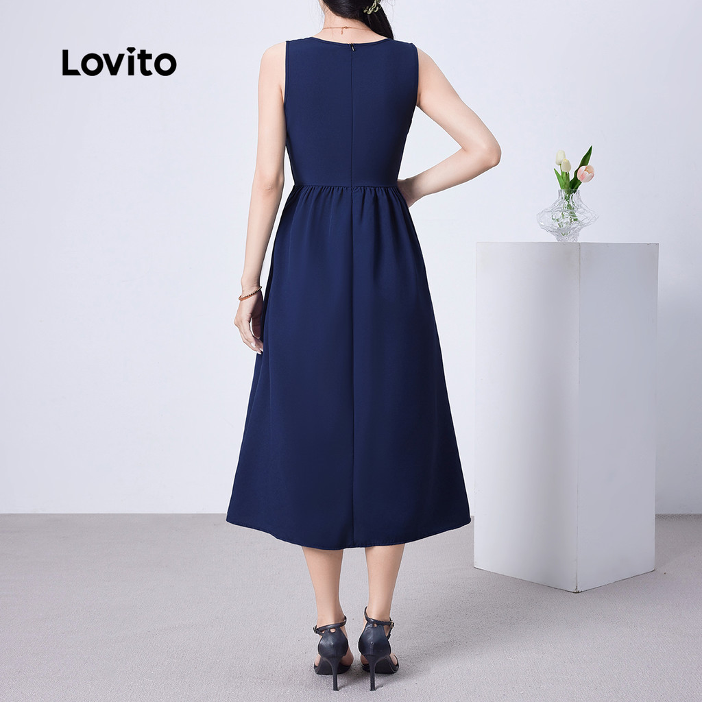 Lovito Botão de Vestido Elegante Tecido Suave Vestido de Primavera/verão Azul Marinho para Mulheres LBL26185