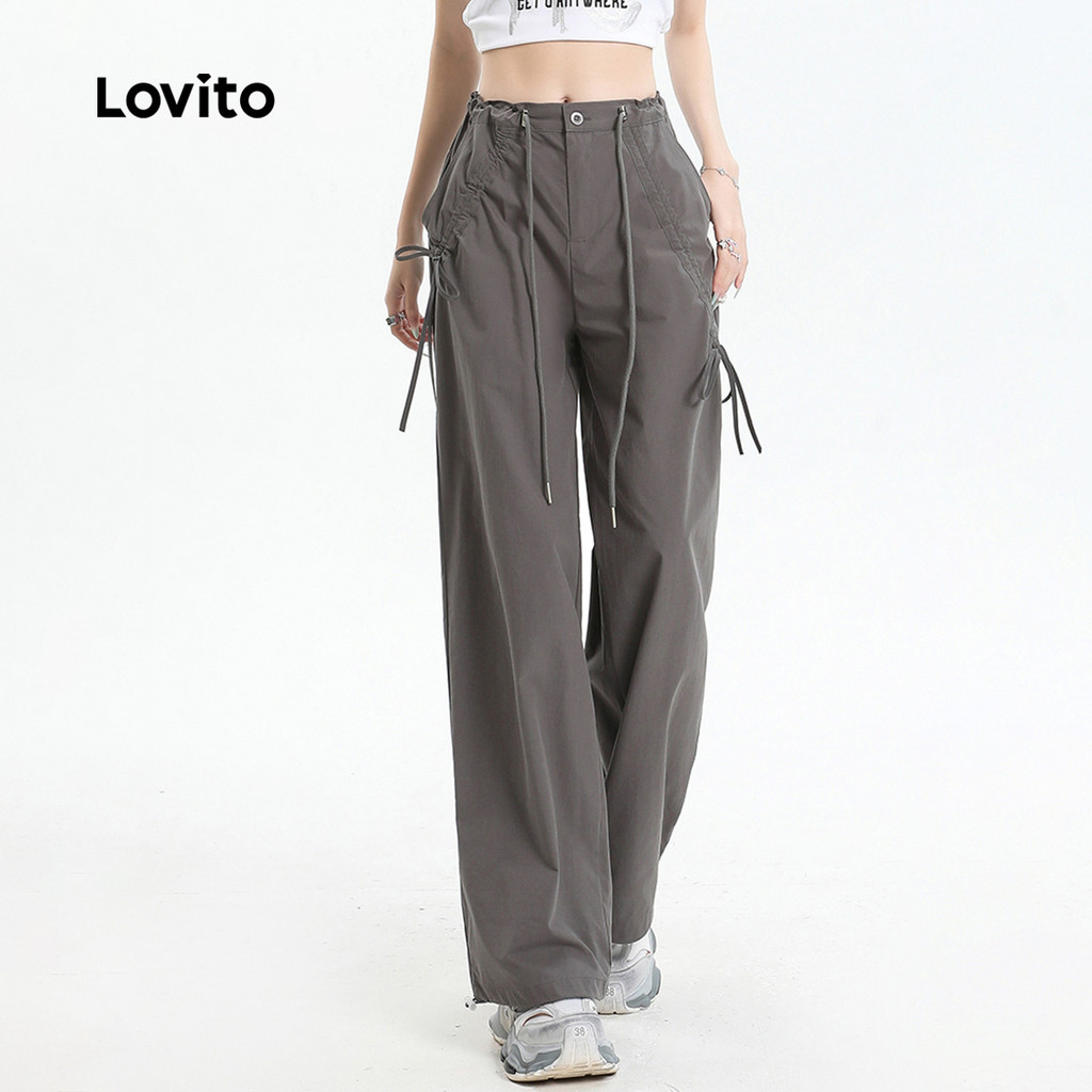 Lovito Calça Casual Com Cordão Liso Franzido Para Mulheres L110AD121