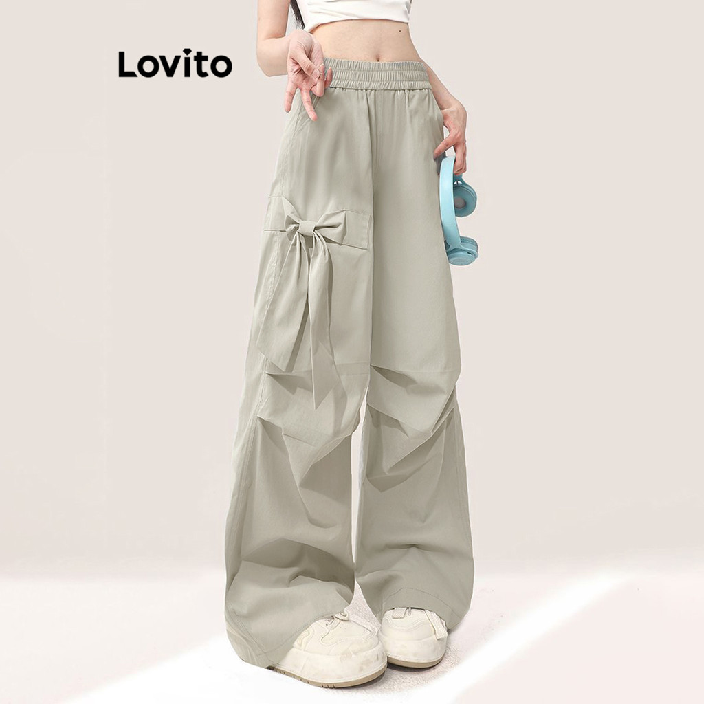 Lovito Calça Feminina Sofisticada de Laço Liso e Plissado LNE69381