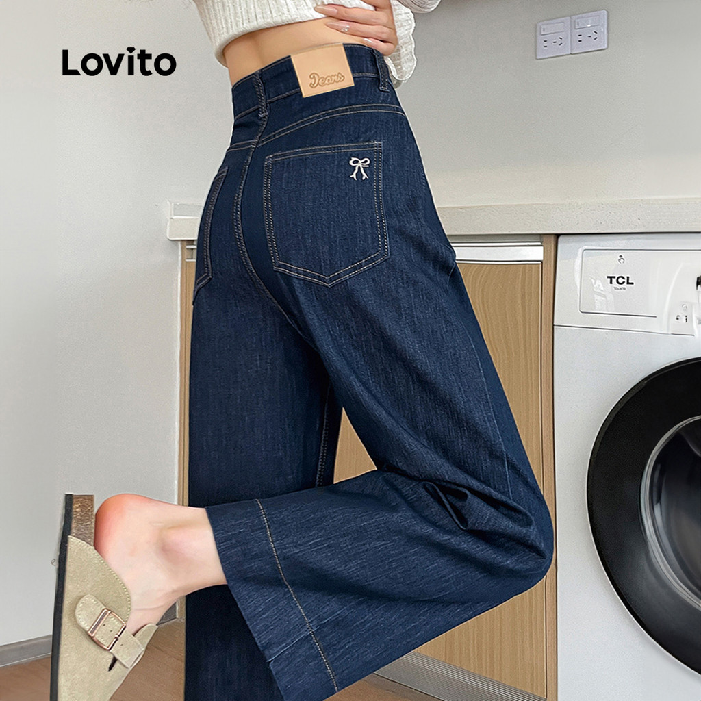 Lovito Calça Jeans Casual Com Bolso Bordado E Laço, Perna Larga E Solta, Azul Escuro, Para Mulheres L135AD1218