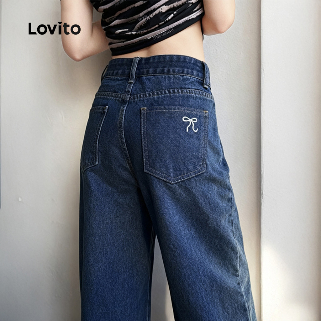 Lovito Calça Jeans Feminina Azul Escuro com Bordado no Bolso para Todas as Estações L166AD347