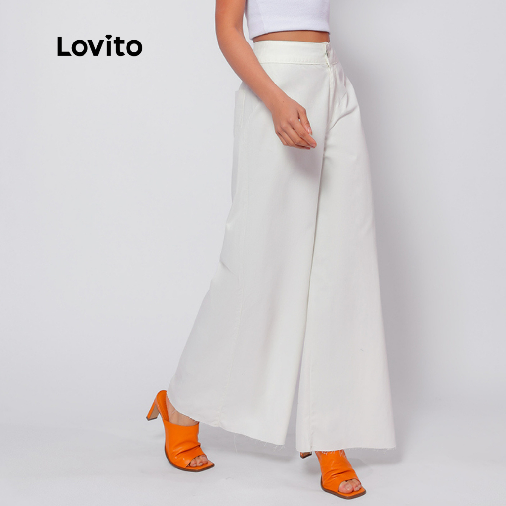 Lovito Calça Jeans Off White Pantalona Cintura Alta Casual Lisa Feminina PTB723BRL753
