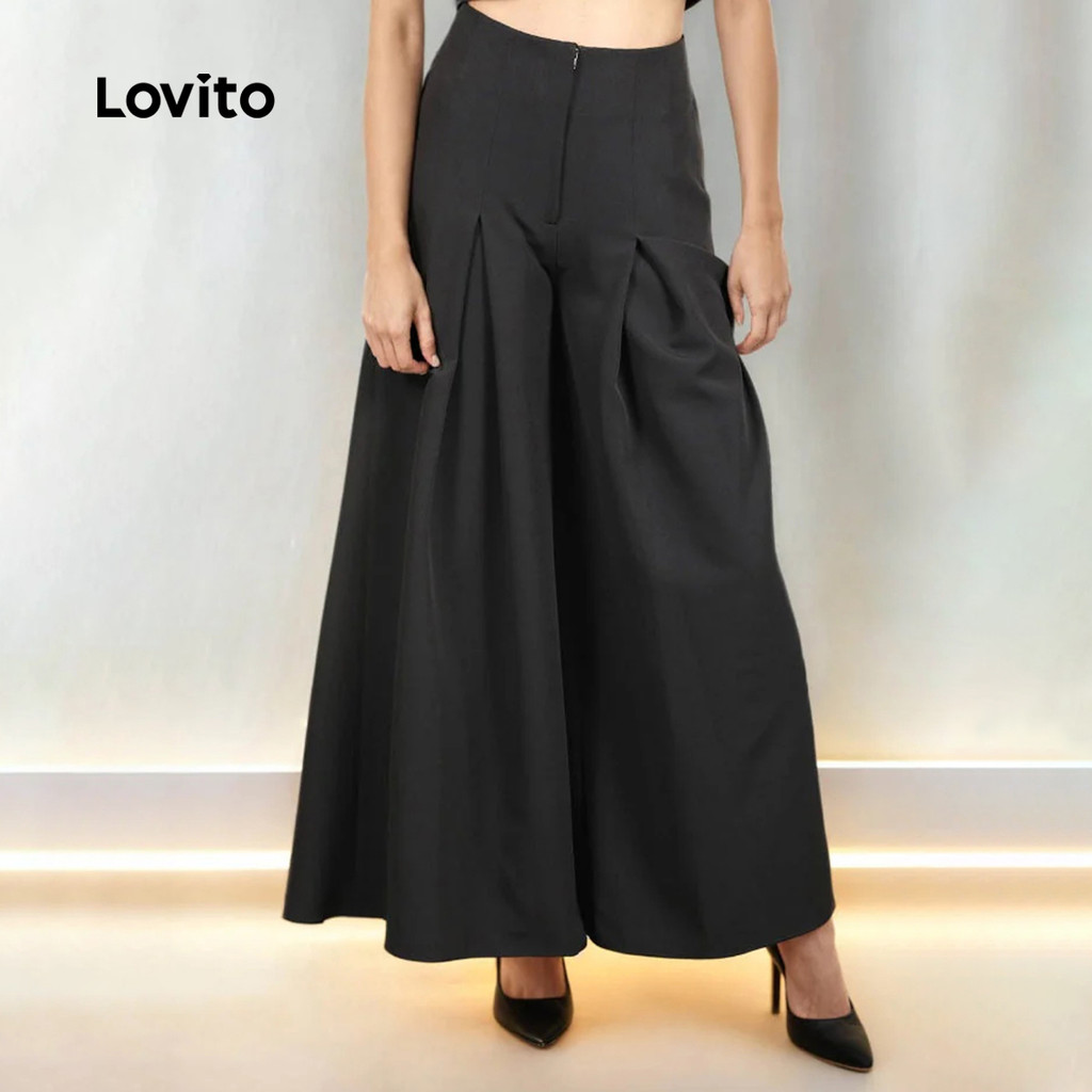 Lovito Calças Elegantes com Pregas e Zíper Preto Primavera/verão Calças para Mulheres LK5LD363