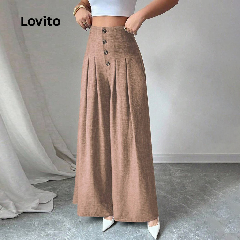 Lovito Calças Femininas Casuais com Botões e Pregas em Cáqui para Primavera Verão LBL30143