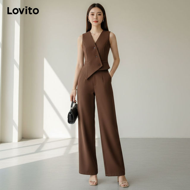 Lovito Calças Femininas Elegantes de Botão para Primavera Verão Marrons Tops ou Calças L158ED727
