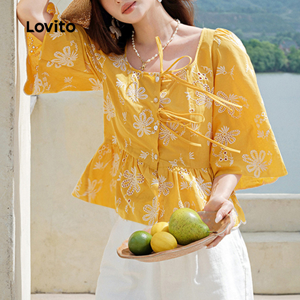 ✅DESTAQUES -❤️Bainha inglesa -❤️Amarre -se -❤️Sentimento de mão suave -❤️Primavera e verão ✅DESCRIÇÕES Estampa / Padrão:Floral Estilo:Casual Tamanho Plus:Não Material:Poliéster Composição:100% poliéster Tipo de modelagem:Folgado Transparência:Não Esticar:Não esticado Feito na China ✅O PACOTE INCLUI 1XBlusa ✅INTRODUÇÃO LOVITO A Lovito é uma marca em crescimento que acredita no poder das meninas. Estamos comprometidos em oferecer opções de roupas fashion e acessíveis, para todos os estilos, necessidades e identidades. Acreditamos que a moda deve ser divertida, liberadora e fazer você se sentir incrível. Afinal, o melhor acessório para qualquer look é a autoconfiança! ✅NOTAS DE COMPRA Antes de comprar, dê uma olhadinha na tabela de medidas disponível no site. Lembre-se de que, por serem feitas manualmente, as medidas podem variar de 1 a 2 cm. As cores dos produtos também podem ter pequenas diferenças em relação às fotos, dependendo da iluminação e das configurações do seu dispositivo. Siga nossa loja e conheça novos itens e as melhores ofertas para você!! Se você tiver alguma dúvida, converse conosco e responderemos o mais rápido possível.😊