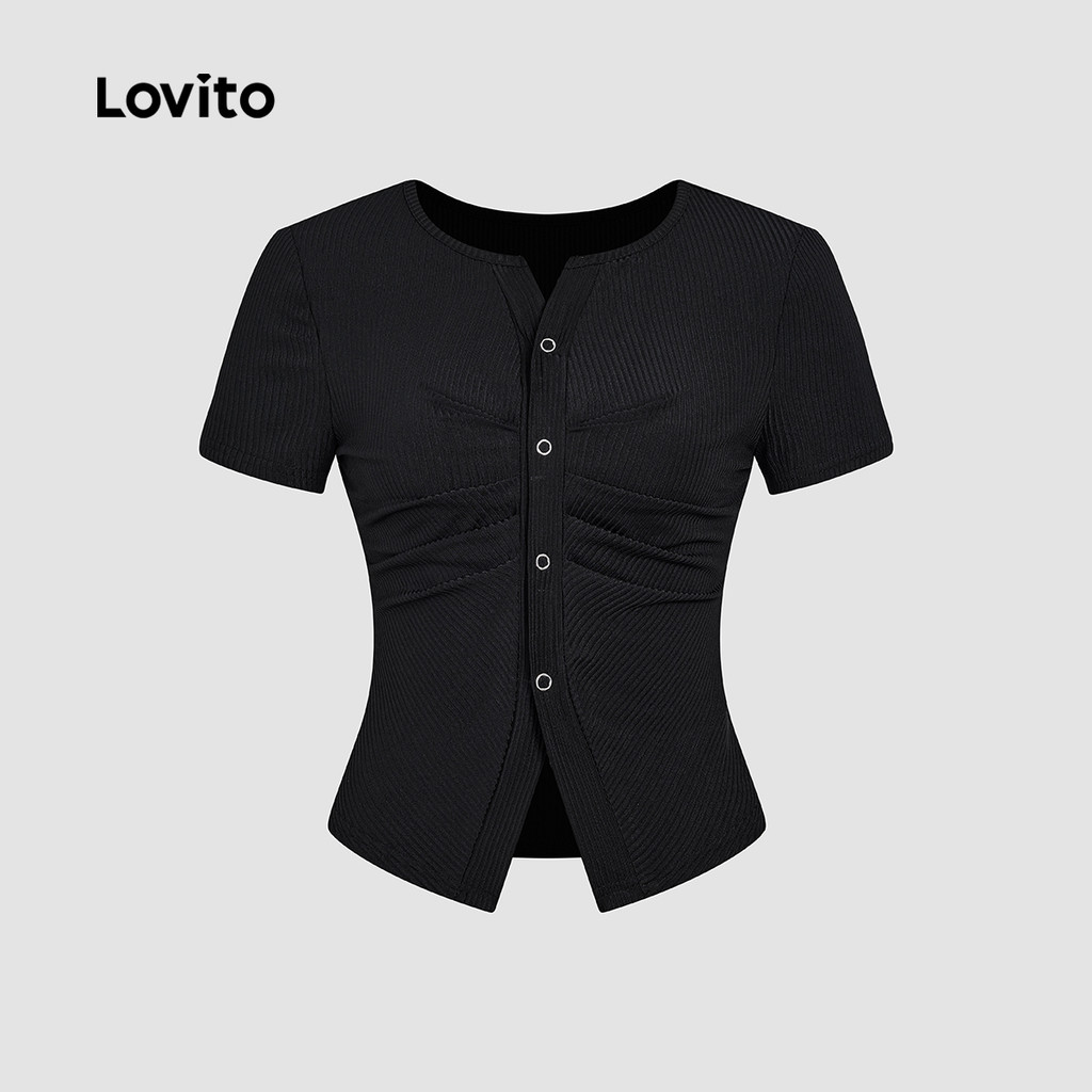 Lovito Camisa Casual de Manga Curta com Pregas para Primavera/verão T-shirt Preta para Mulheres L143ED206