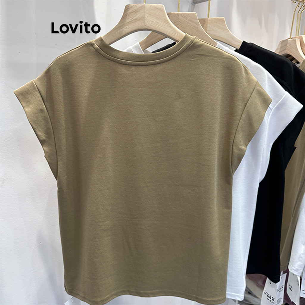 Lovito Camiseta Casual Acolchoada Com Letras Básicas Para Mulheres LNA24019 (Cáqui/Branco/Preto)