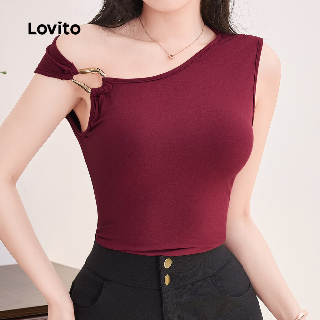 Lovito Camiseta Casual Assimetria Fivela Metálica Franzida Primavera/verão Borgonha para Mulheres L178ED2125