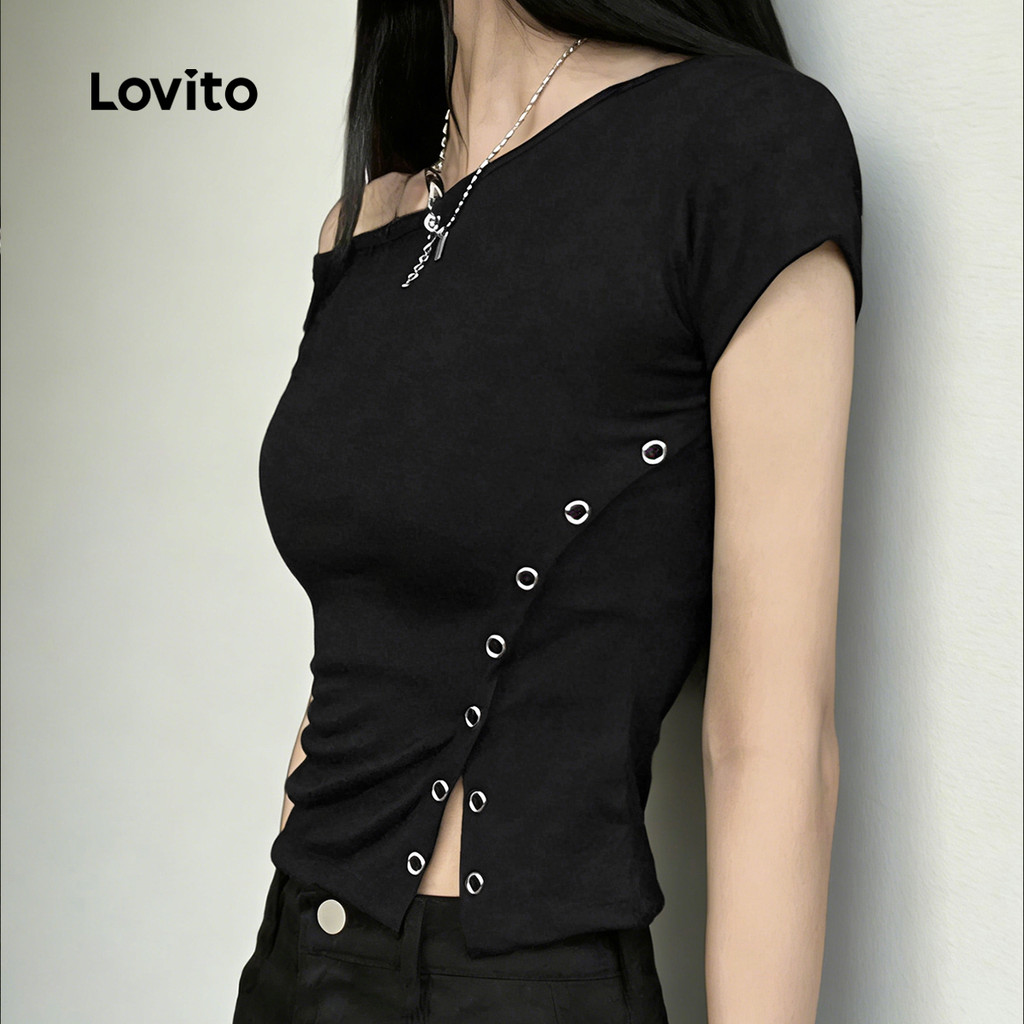 Lovito Camiseta Casual Assimétrica Botão Primavera/verão Preta Camiseta para mulheres. L171ED351