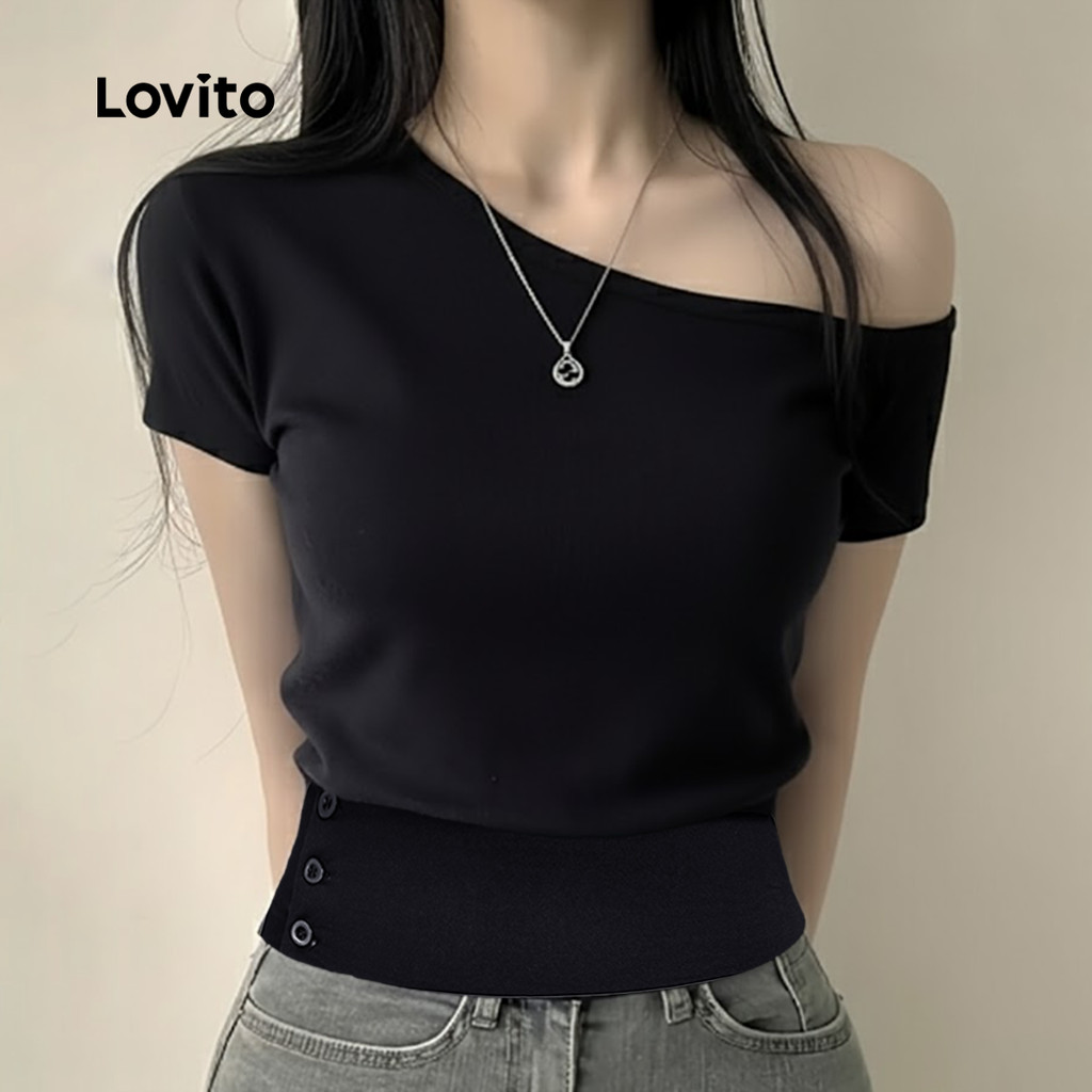 Lovito Camiseta Casual Assimétrica Preta para Mulheres Primavera/Verão LK2ED060