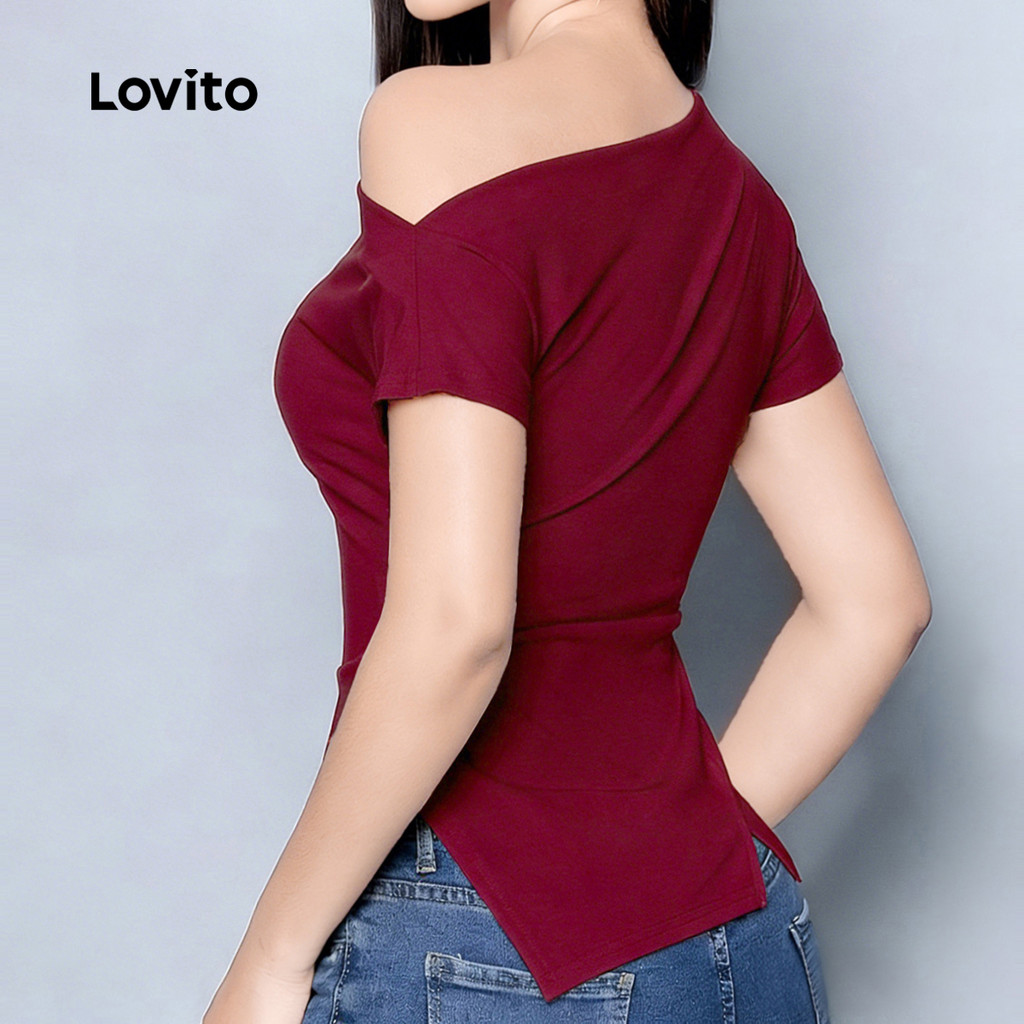 Lovito Camiseta Casual Assimétrica Primavera/verão Vinho para Mulheres. L172ED735