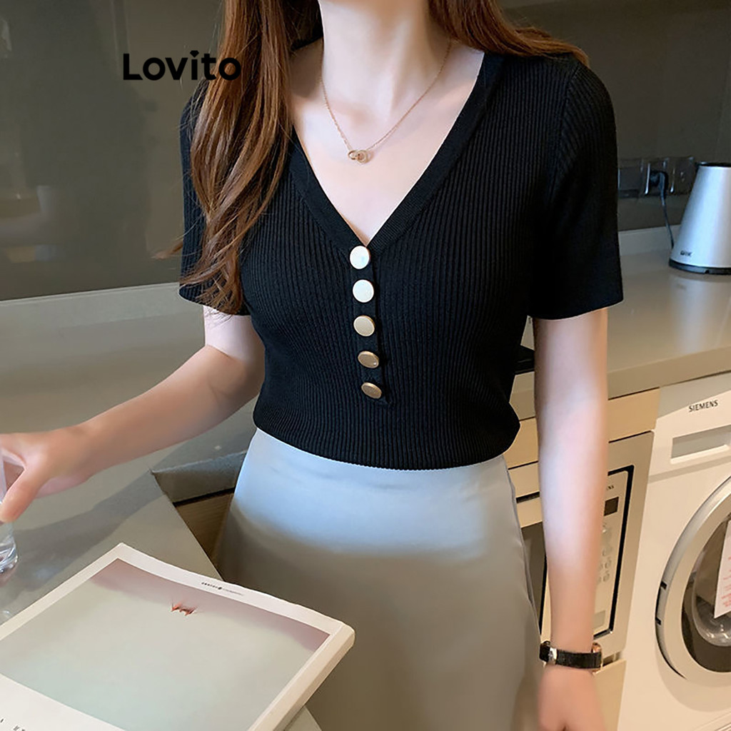 Lovito Camiseta Casual Com Botão Verão/Primavera Para Mulheres LNL36064