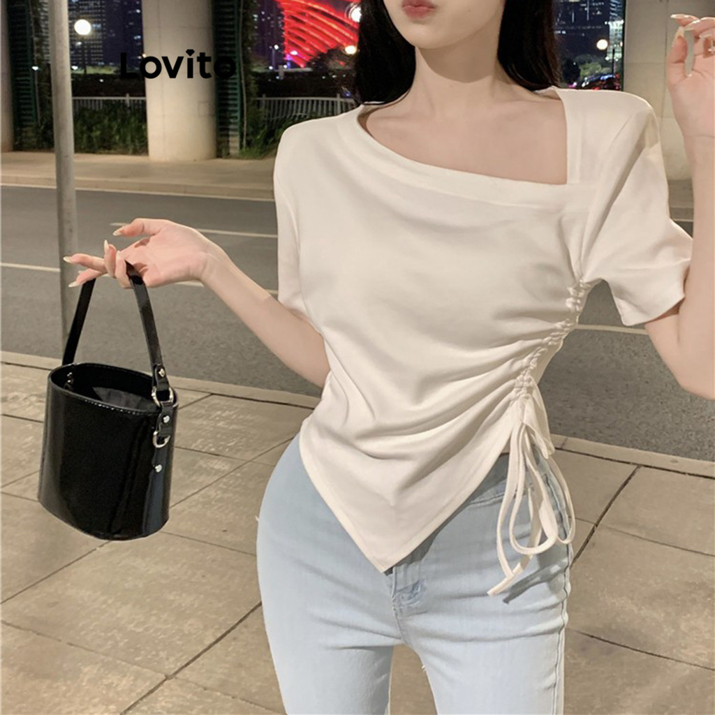 Lovito Camiseta Casual Com Cordão Liso Franzido Para Mulheres LNE33146 (Branco/Preto)