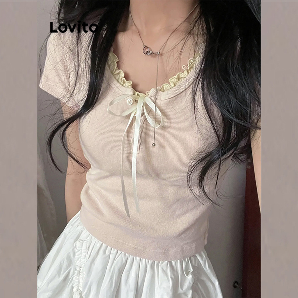 Lovito Camiseta Casual Com Cordão Liso Para Mulheres LNA27322 (Rosa)