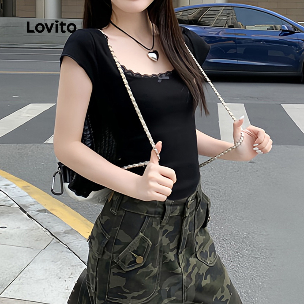Lovito Camiseta Casual Com Laço De Renda Verão/Primavera Para Mulheres L123ED773