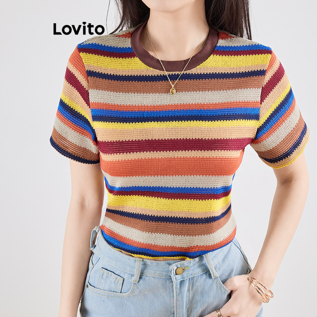 Lovito Camiseta casual com listras em arco-íris e cores contrastantes para mulheres L120ED073