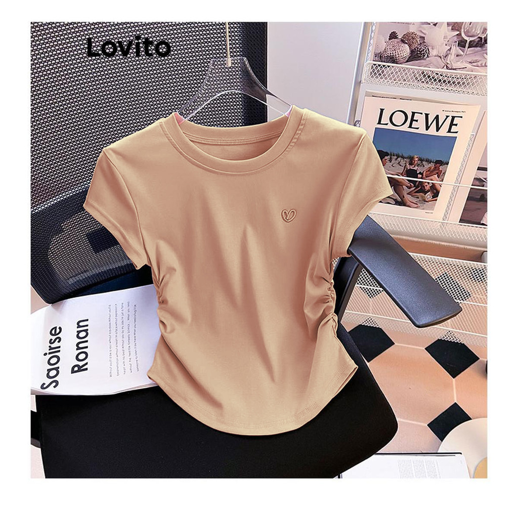 Lovito Camiseta Casual Lisa com Detalhes Plissados para Mulheres LNE39028 (Multicolorido)