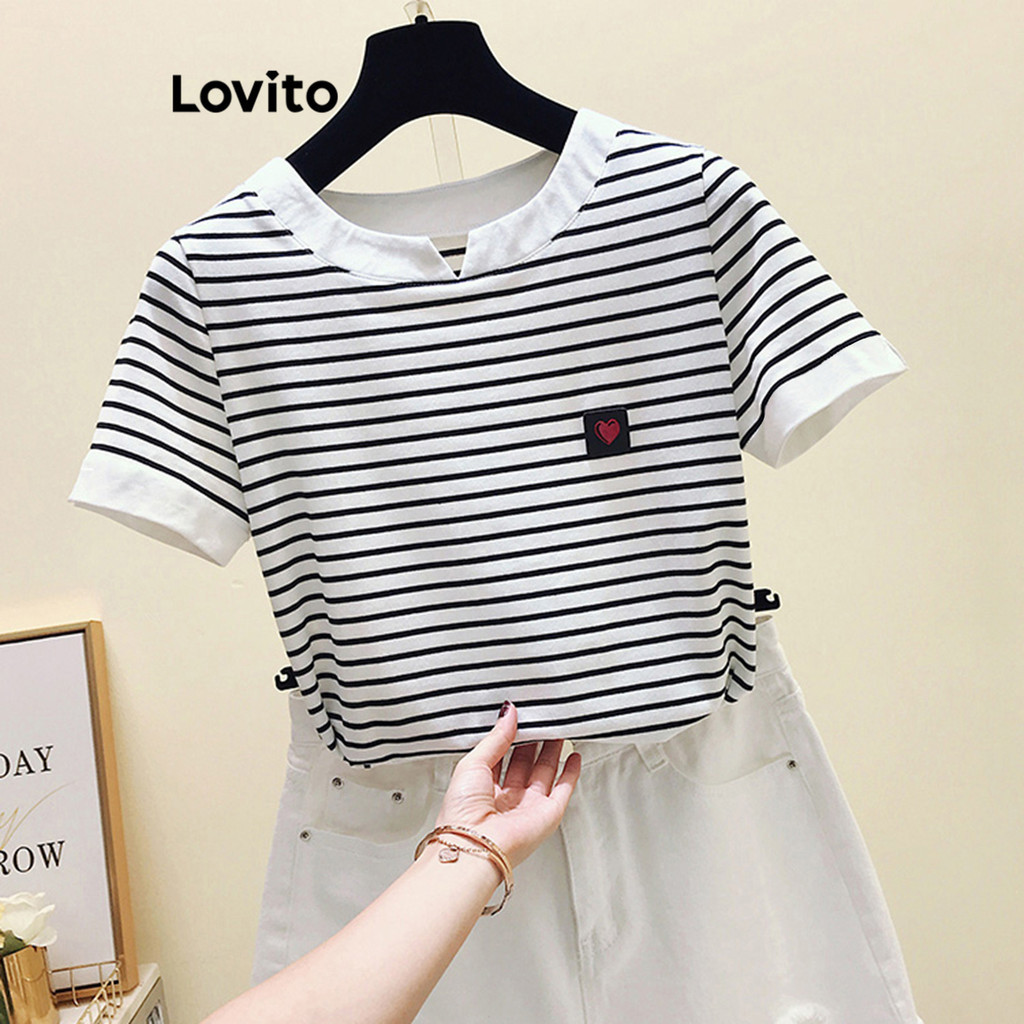 Lovito Camiseta Casual Listrada Com Gola Contrastante Para Mulheres LNE39558 (Multicolorido)
