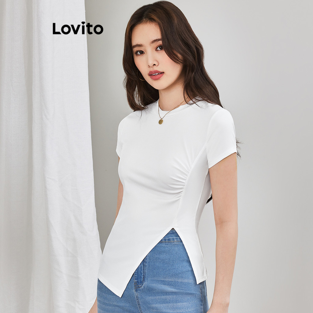 Lovito Camiseta Elegante Lisa Plissada Dividida Para Mulheres L65ED029 (Branco)