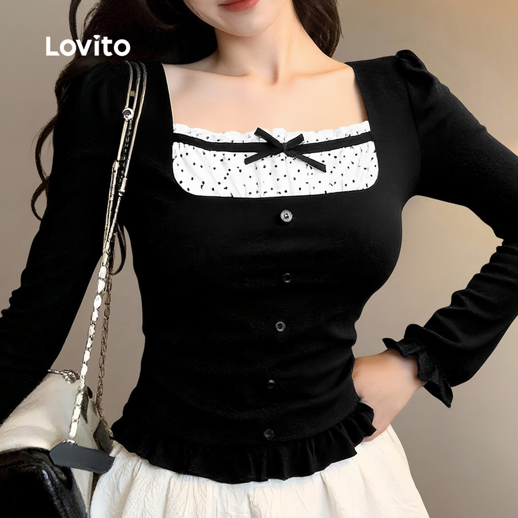 ✅DESTAQUES -❤️Babado -❤️Sensação de mão suave -❤️outono e inverno ✅DESCRIÇÕES Estampa / Padrão:Plain Estilo: Fofo Tamanho Plus:No Material: Poliéster Composição:95%Polyester+5%Spandex Tipo de modelagem: Slim Fit Transparência:No Esticar:High Stretch Feito na China ✅O PACOTE INCLUI 1XCamiseta ✅INTRODUÇÃO LOVITO A Lovito é uma marca em crescimento que acredita no poder das meninas. Estamos comprometidos em oferecer opções de roupas fashion e acessíveis, para todos os estilos, necessidades e identidades. Acreditamos que a moda deve ser divertida, liberadora e fazer você se sentir incrível. Afinal, o melhor acessório para qualquer look é a autoconfiança! ✅NOTAS DE COMPRA Antes de comprar, dê uma olhadinha na tabela de medidas disponível no site. Lembre-se de que, por serem feitas manualmente, as medidas podem variar de 1 a 2 cm. As cores dos produtos também podem ter pequenas diferenças em relação às fotos, dependendo da iluminação e das configurações do seu dispositivo. Siga nossa loja e conheça novos itens e as melhores ofertas para você!! Se você tiver alguma dúvida, converse conosco e responderemos o mais rápido possível.😊