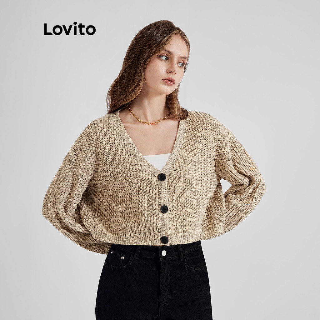 Lovito Cardigãs Casuais Lisos De Manga Comprida Com Botões E Cardigã De Malha Para Mulheres L21LT091 (Cáqui/Branco)