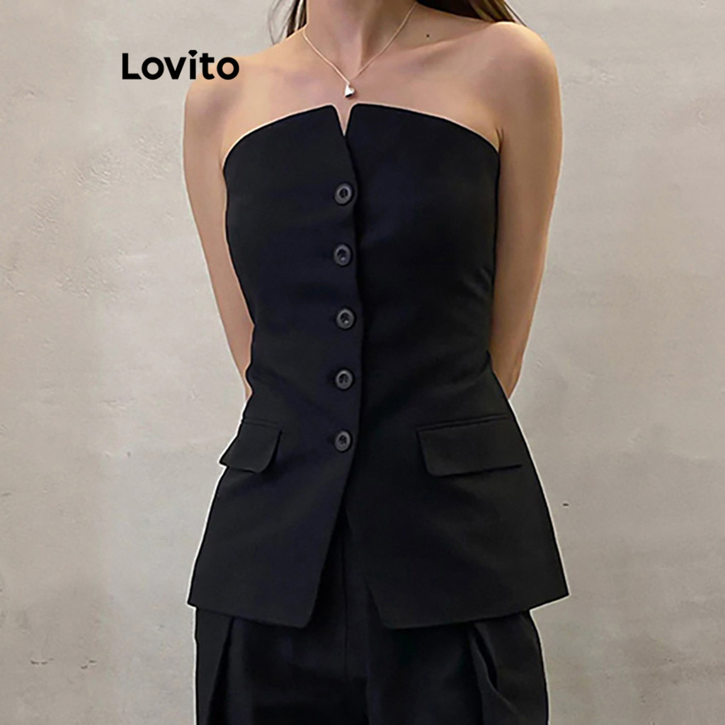 Lovito Casual Blusa Feminina Lisa com Botão LNL39074 (Preto)