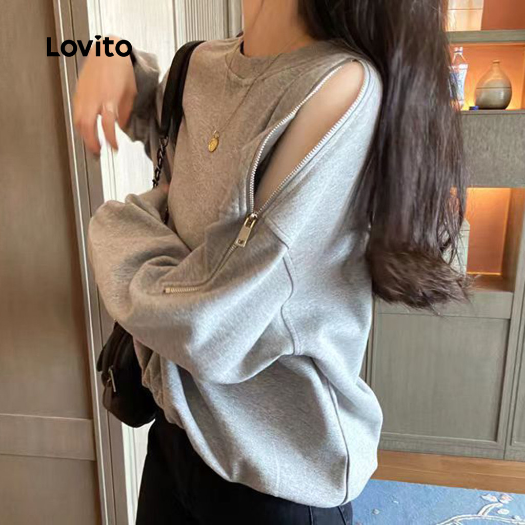 Lovito Casual Sweatshirt Zíper Lazer Outono/inverno Cinza Moletom para Mulheres LNA121031