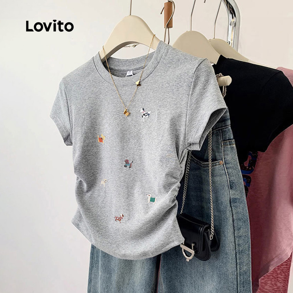 Lovito Casual T-shirt Padrão Simples Lazer Primavera/verão Camiseta Preta para mulheres. L179AD107