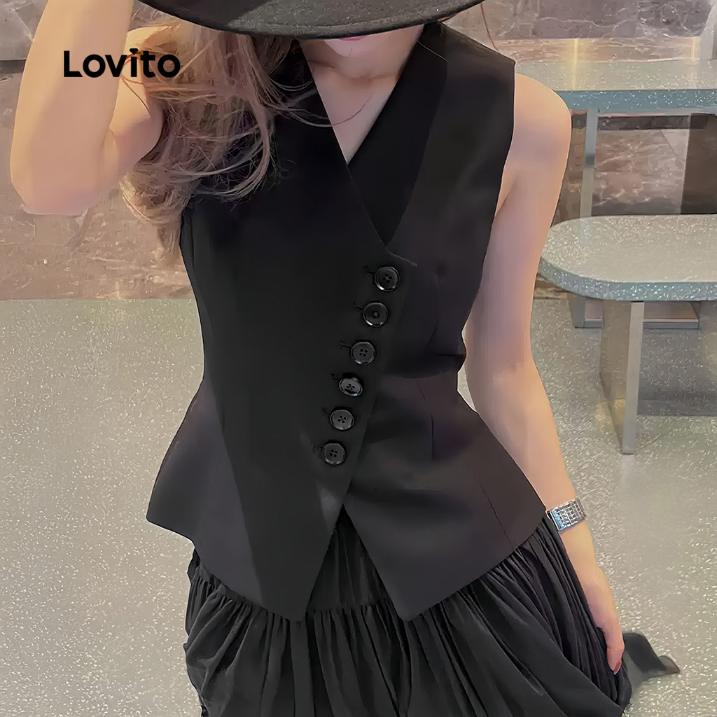 Lovito Casual Top Assimétrico com Botão Primavera/verão Preto Top para Mulheres. L178ED334