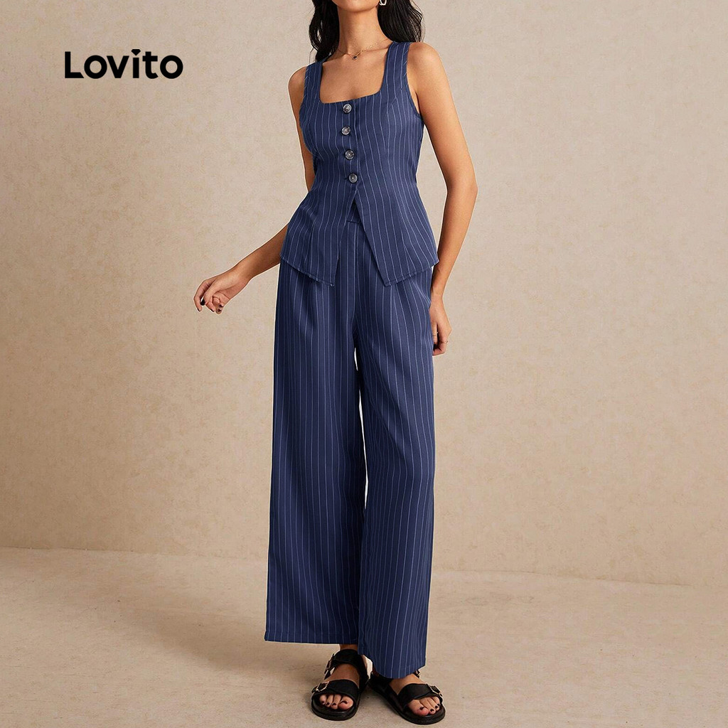 Lovito Conjunto Calça Blusa Listradas Elegantes Botões Frontais Amarração Costas Ideal Para Todas As Estações LBL23201