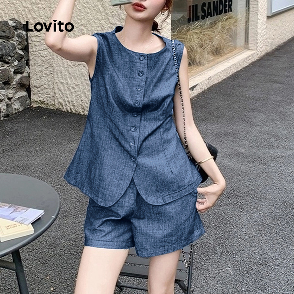 Lovito Conjunto Casual Linho Confortável Composto Regata Shorts Botões Azul-marinho Primavera/verão Mulheres LBL30111