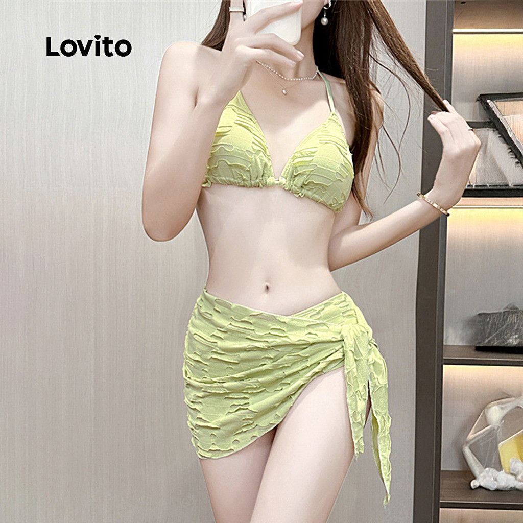 Lovito Conjunto de Biquíni Casual 3 Padrões Pregas Verde Primavera/verão Biquíni Feminino LNE141014