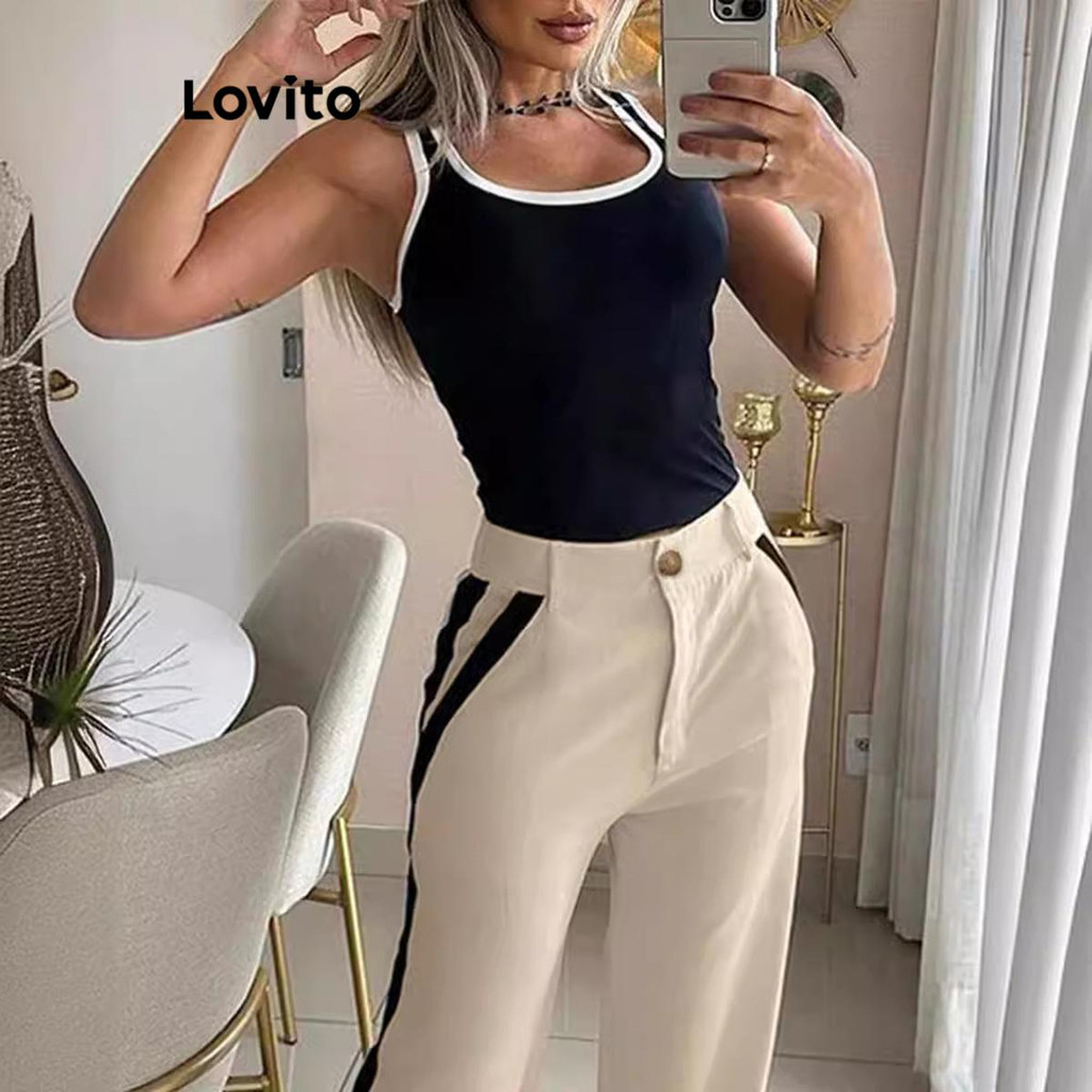 Lovito Conjunto de Calças Femininas Elegantes com Amarração e Contraste Liso LNL67157