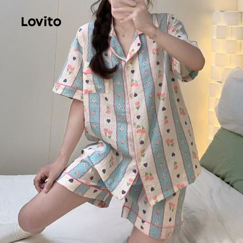 Lovito Conjunto de Pijama Casual 2 Peças Casa e Exterior e Linho Mãe/Verão para Mulheres LNE121076