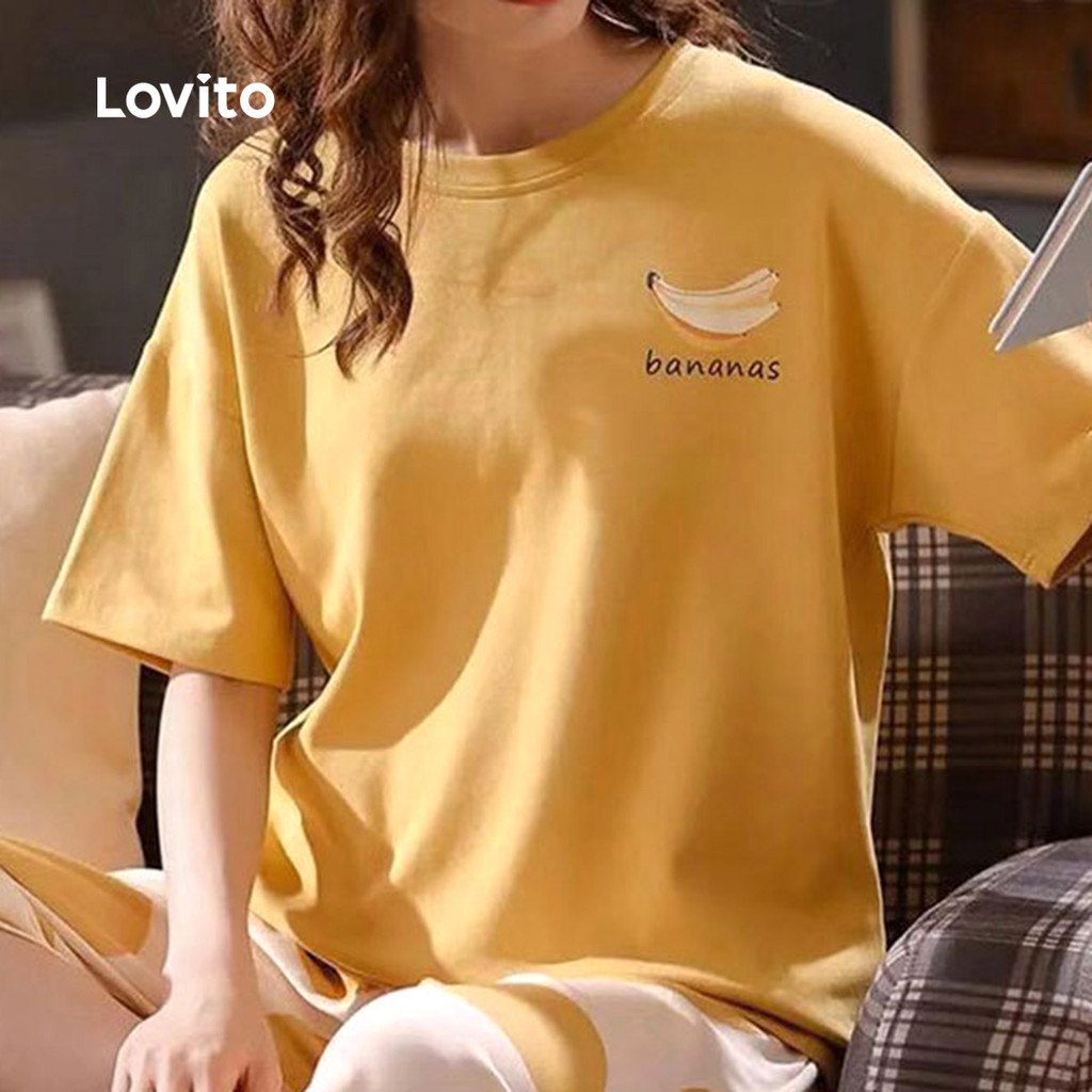 Lovito Conjunto de Pijamas Fofos Pack de 2 com Estampas Combinadas Primavera/verão Pijamas Amarelos LNE117233