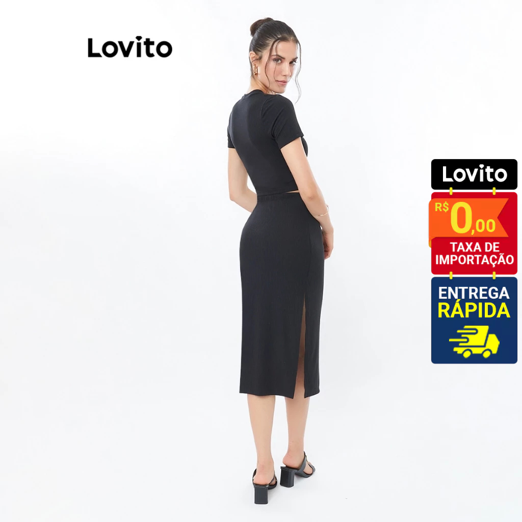 Lovito Conjunto de Top Cropped e Saia Midi com Fenda Preto Basico Feminino KSB298BRL327