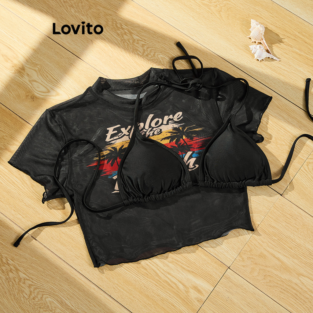 Lovito Conjuntos Boho Com Letras E Recortes Em Malha, Conjuntos De Biquíni Verão/primavera Para Mulheres LBL19756