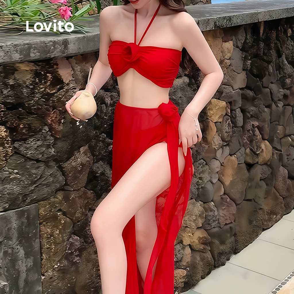 Lovito Conjuntos de Biquíni Sexy Conjuntos de Biquíni Vermelho de Renda com 3 Peças para Mulheres LNE134040
