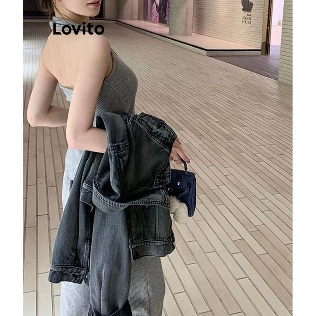 Lovito Conjuntos De Calças Casuais Com Botão Liso Frontal Sem Costas Conjuntos De Calças Para Mulheres LNE43142